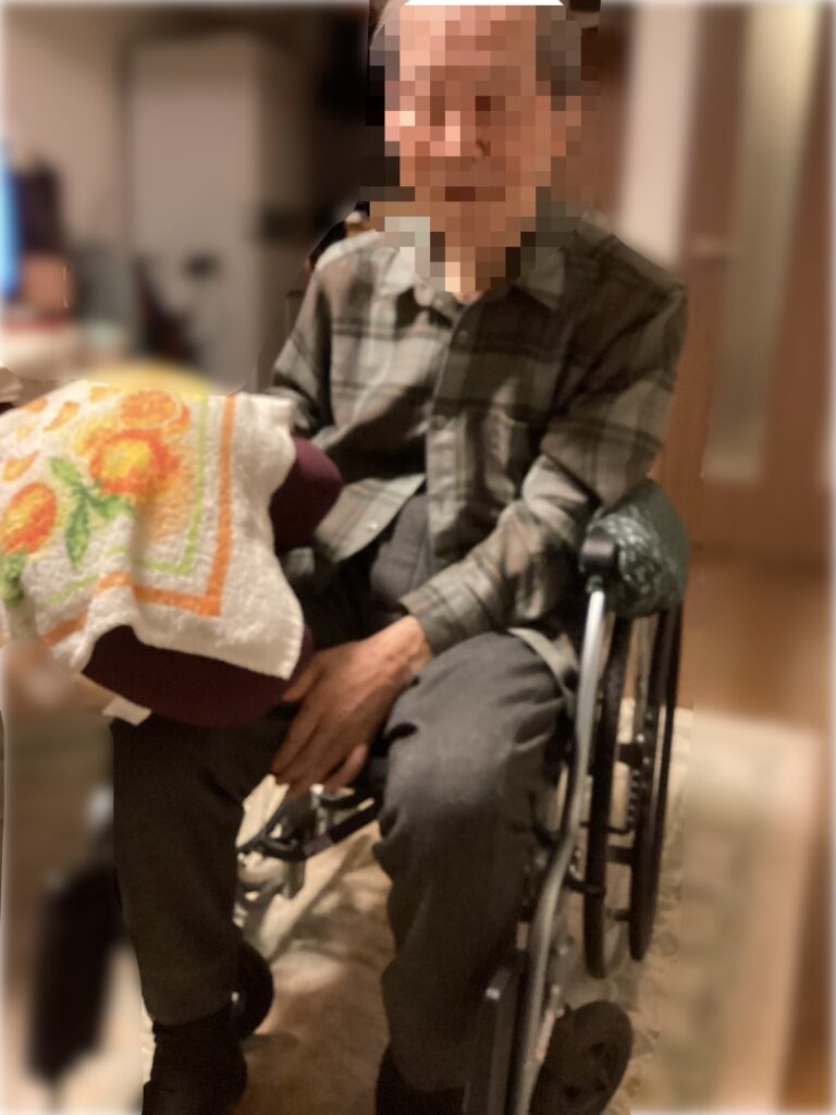 この写真は訪問した時に、薬が切れてしまい左に傾いてしまっている時です。施術後は、体の自由が効くようになり、ご自身で車椅子を座りなし、体幹も安定するようになっています。この写真は今年の1月後半ごろでしたが、現在も左に倒れていくのは落ち着いているようです。